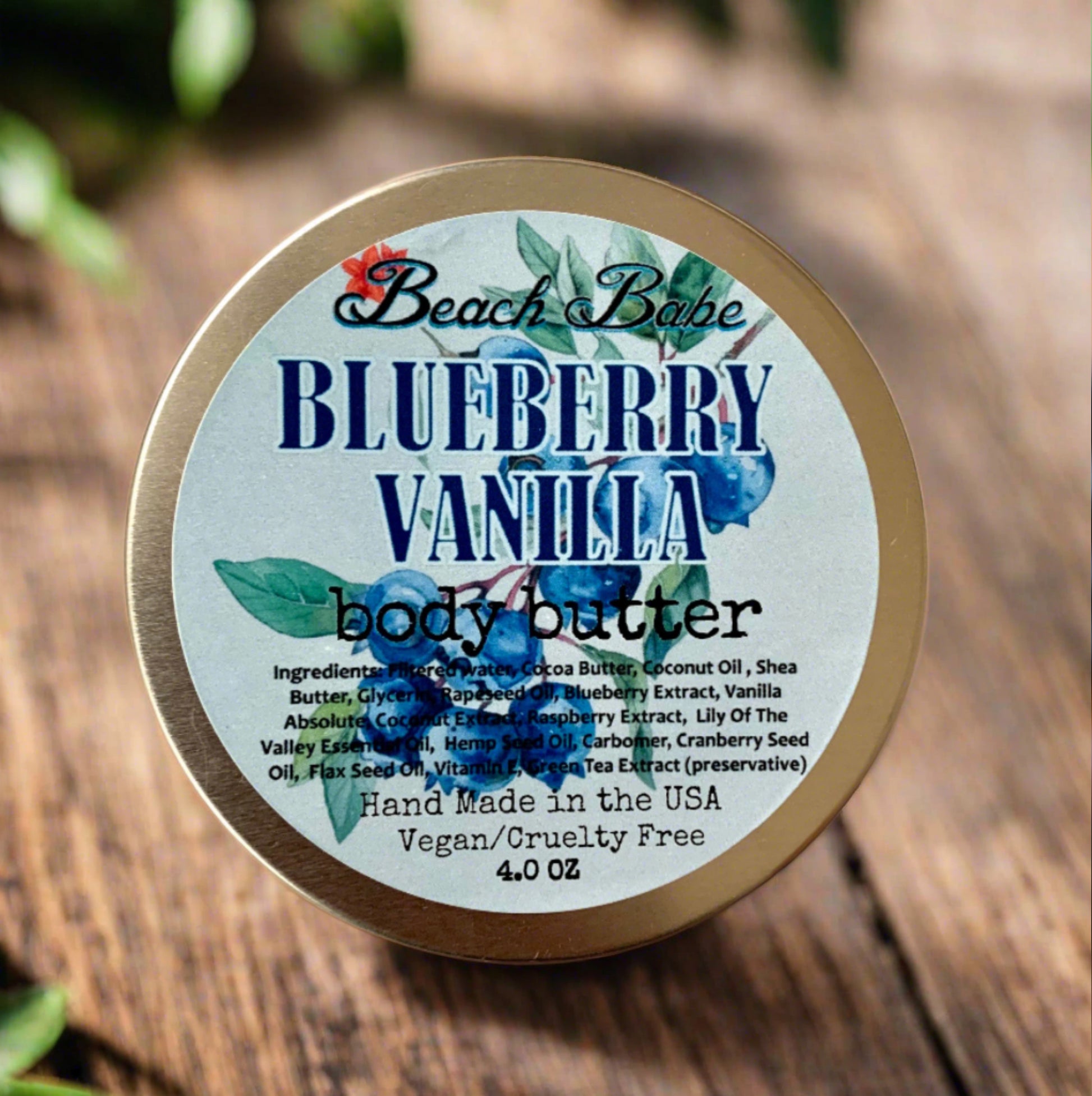 Ingredients: Filtered Water, Cocoa Butter, Coconut Oil, Shea Butter, Glycerin, Rapeseed Oil, Blueberry Extract, Vanilla Absolute, Coconut Extract, Raspberry Extract, Lily Of The Valley Essential Oil, Hemp Seed Oil, Carbomer, Cranberry Seed Oil, Flax Seed Oil, Vitamin E, Green Tea Extract (Preservative)