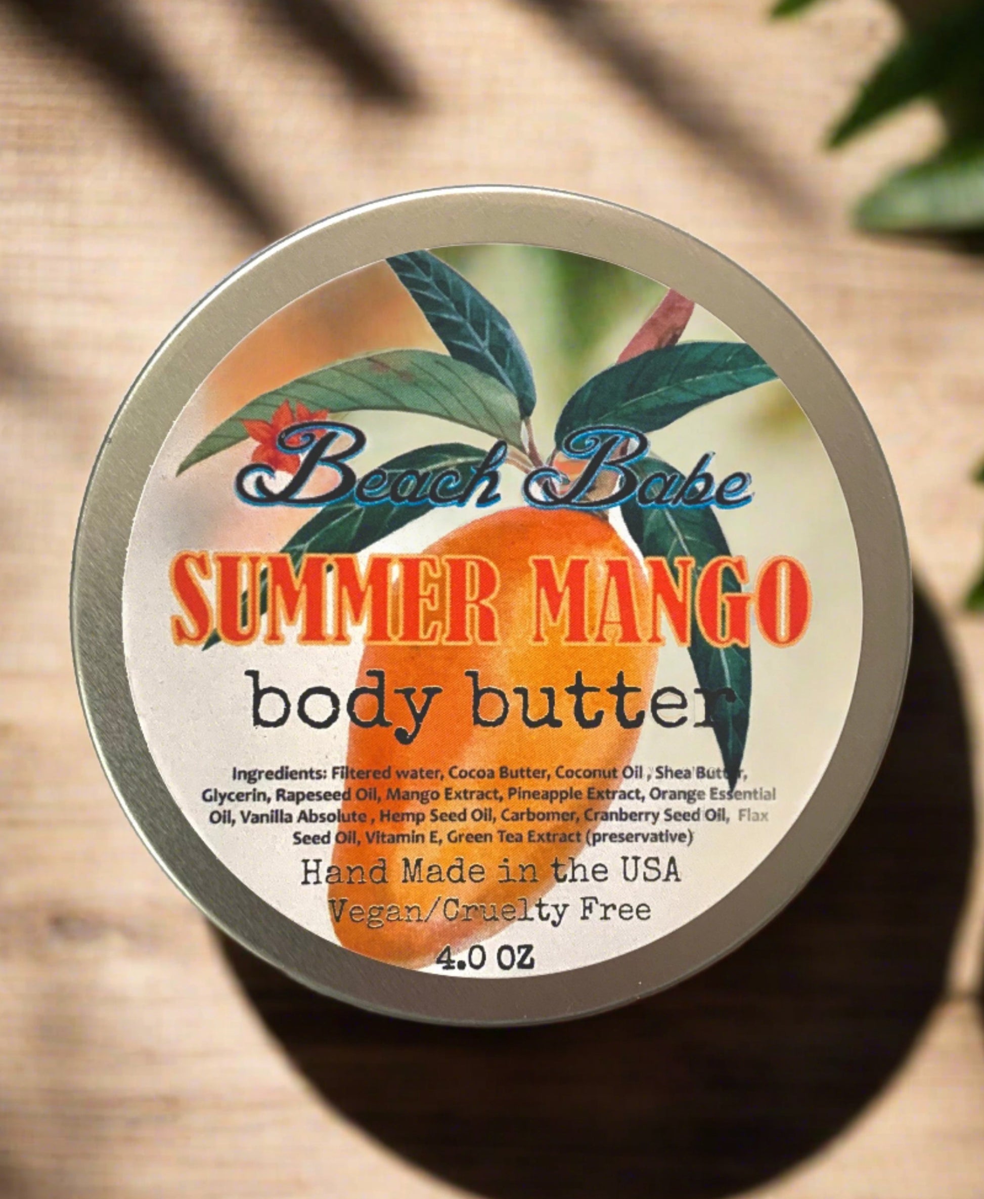 Indulge in the sweet and creamy scent of Summer Mango Body Butter. Let the nostalgic notes of fresh fruit and vanilla transport you to warm summer days. Moisturize and rejuvenate your skin with this luxurious product that will leave you feeling refreshed and renewed.
